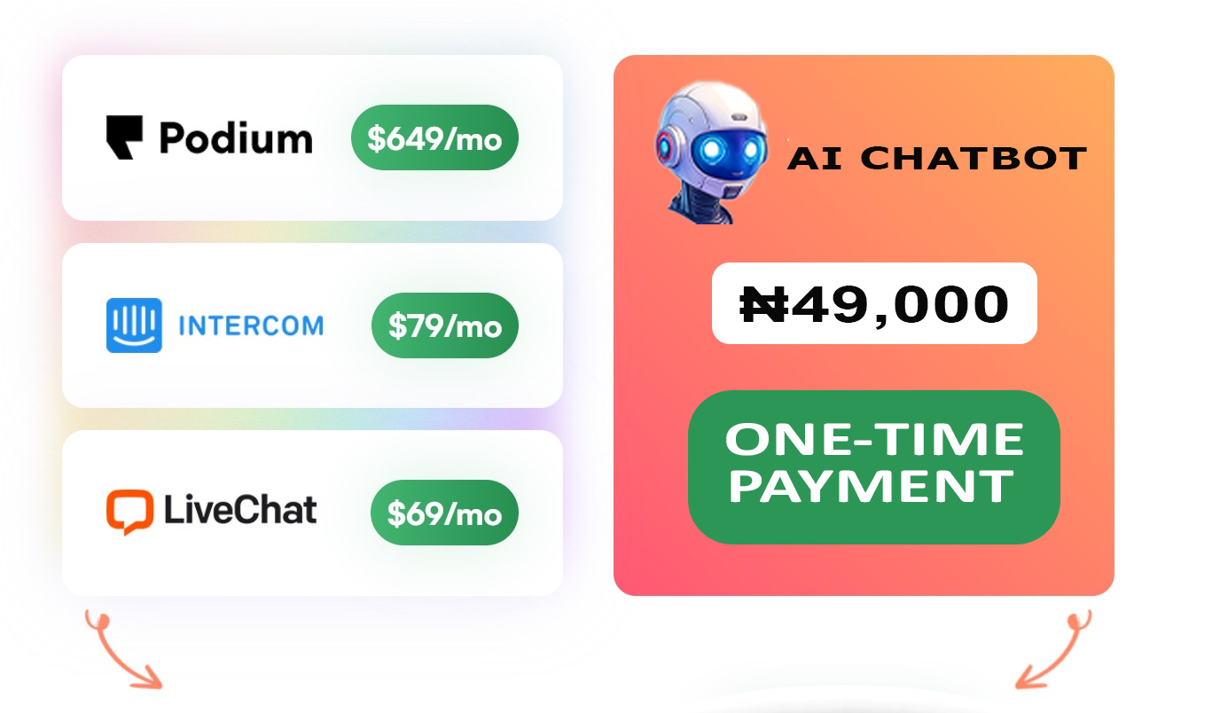 This is a one-time investment for the initial app, installation, and configuration. There are no hidden fees and no monthly or annual upsells for the initial service provided. Please note: If you require us to retrain your AI Chatbot with a significant amount of additional data after 30 days of purchase, a separate service fee of N29,000 will apply.